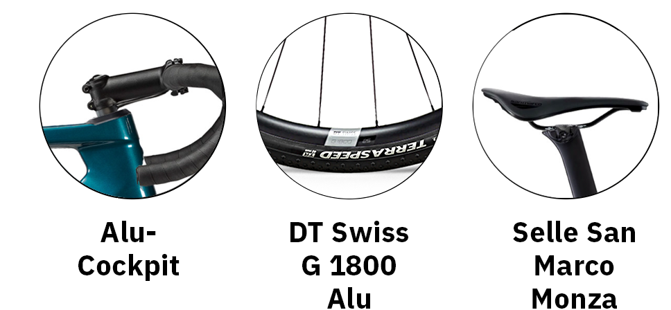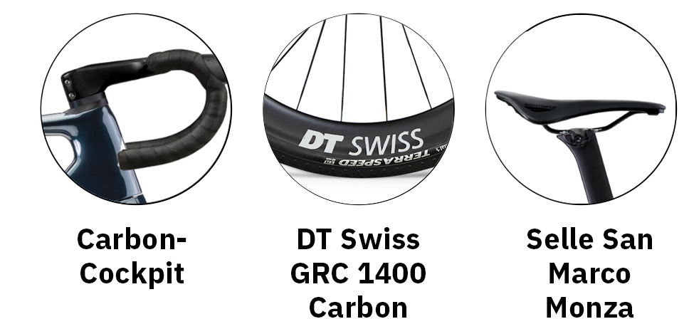 Topramme med aluminumshjulsæt og -cockpit. Semi-integrerede kabler. Value-grupper med elektroniske gear.