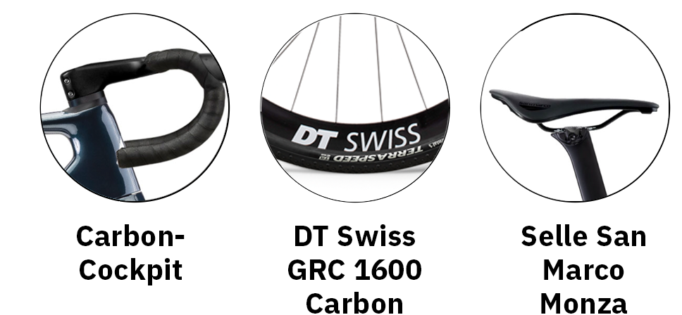 Topramme med carbonhjulsæt og -cockpit. Fuldt integrerede kabler. Medium range-grupper.