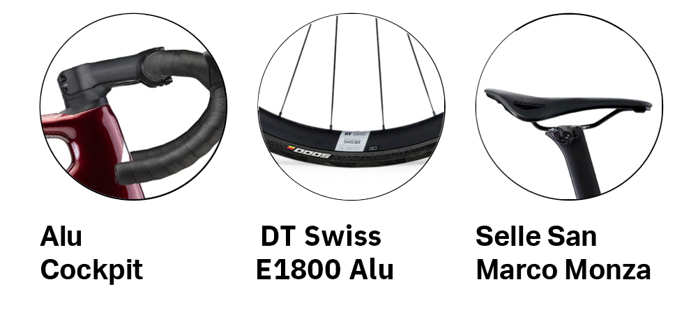 Topramme med aluminumshjulsæt og -cockpit. Semi-integrerede kabler. Value-grupper med elektroniske gear.